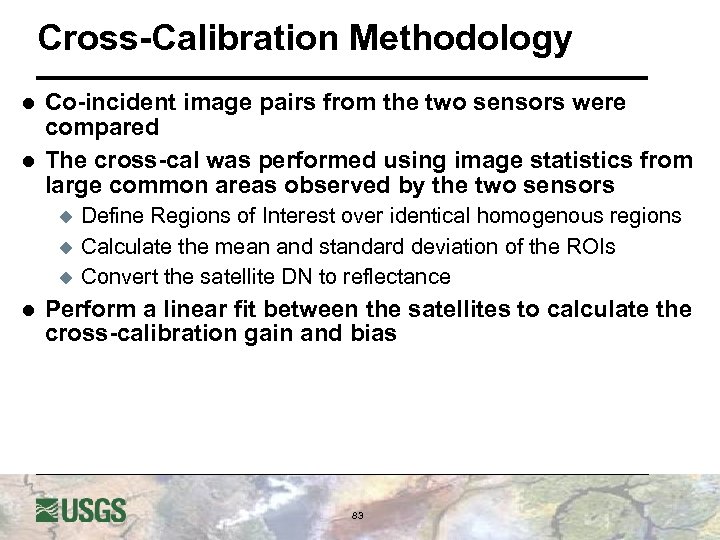 Cross-Calibration Methodology l l Co-incident image pairs from the two sensors were compared The cross-cal was performed using image statistics from large common areas observed by the two sensors u u u l Define Regions of Interest over identical homogenous regions Calculate the mean and standard deviation of the ROIs Convert the satellite DN to reflectance Perform a linear fit between the satellites to calculate the cross-calibration gain and bias 83