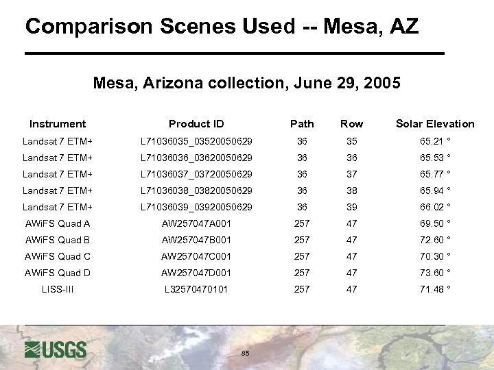 Comparison Scenes Used -- Mesa, AZ Mesa, Arizona collection, June 29, 2005 Instrument Product ID Path Row Solar Elevation Landsat 7 ETM+ L 71036035_03520050629 36 35 65. 21 ° Landsat 7 ETM+ L 71036036_03620050629 36 36 65. 53 ° Landsat 7 ETM+ L 71036037_03720050629 36 37 65. 77 ° Landsat 7 ETM+ L 71036038_03820050629 36 38 65. 94 ° Landsat 7 ETM+ L 71036039_03920050629 36 39 66. 02 ° AWi. FS Quad A AW 257047 A 001 257 47 69. 50 ° AWi. FS Quad B AW 257047 B 001 257 47 72. 60 ° AWi. FS Quad C AW 257047 C 001 257 47 70. 30 ° AWi. FS Quad D AW 257047 D 001 257 47 73. 60 ° LISS-III L 32570470101 257 47 71. 48 ° 85
