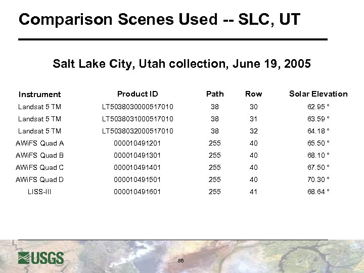 Comparison Scenes Used -- SLC, UT Salt Lake City, Utah collection, June 19, 2005 Instrument Product ID Path Row Solar Elevation Landsat 5 TM LT 5038030000517010 38 30 62. 95 ° Landsat 5 TM LT 5038031000517010 38 31 63. 59 ° Landsat 5 TM LT 5038032000517010 38 32 64. 18 ° AWi. FS Quad A 000010491201 255 40 65. 50 ° AWi. FS Quad B 000010491301 255 40 68. 10 ° AWi. FS Quad C 000010491401 255 40 67. 50 ° AWi. FS Quad D 000010491501 255 40 70. 30 ° LISS-III 000010491601 255 41 68. 64 ° 86