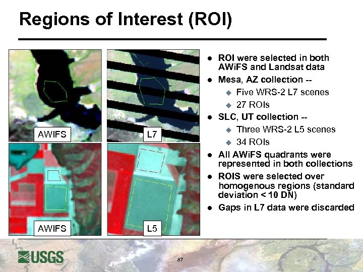 Regions of Interest (ROI) l l l AWIFS L 7 l l l AWIFS L 5 87 ROI were selected in both AWi. FS and Landsat data Mesa, AZ collection -u Five WRS-2 L 7 scenes u 27 ROIs SLC, UT collection -u Three WRS-2 L 5 scenes u 34 ROIs All AWi. FS quadrants were represented in both collections ROIS were selected over homogenous regions (standard deviation < 10 DN) Gaps in L 7 data were discarded