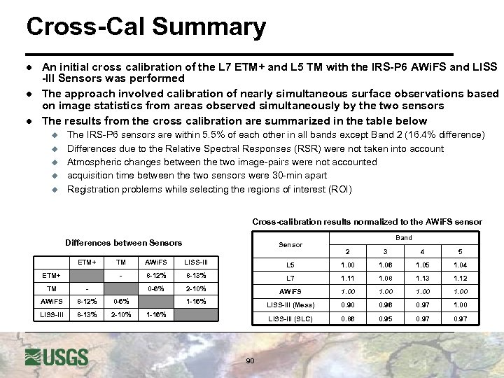 Cross-Cal Summary l l l An initial cross calibration of the L 7 ETM+ and L 5 TM with the IRS-P 6 AWi. FS and LISS -III Sensors was performed The approach involved calibration of nearly simultaneous surface observations based on image statistics from areas observed simultaneously by the two sensors The results from the cross calibration are summarized in the table below u u u The IRS-P 6 sensors are within 5. 5% of each other in all bands except Band 2 (16. 4% difference) Differences due to the Relative Spectral Responses (RSR) were not taken into account Atmospheric changes between the two image-pairs were not accounted acquisition time between the two sensors were 30 -min apart Registration problems while selecting the regions of interest (ROI) Cross-calibration results normalized to the AWi. FS sensor Differences between Sensors ETM+ Sensor Band 2 3 4 5 AWi. FS LISS-III L 5 1. 00 1. 06 1. 05 1. 04 - ETM+ TM 8 -12% 8 -13% L 7 1. 11 1. 08 1. 13 1. 12 0 -6% 2 -10% AWi. FS 1. 00 LISS-III (Mesa) 0. 90 0. 96 0. 97 1. 00 LISS-III (SLC) 0. 86 0. 95 0. 97 TM - AWi. FS 8 -12% 0 -6% LISS-III 8 -13% 2 -10% 1 -16% 90
