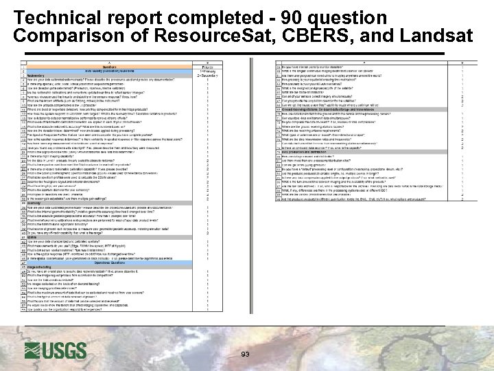 Technical report completed - 90 question Comparison of Resource. Sat, CBERS, and Landsat 93
