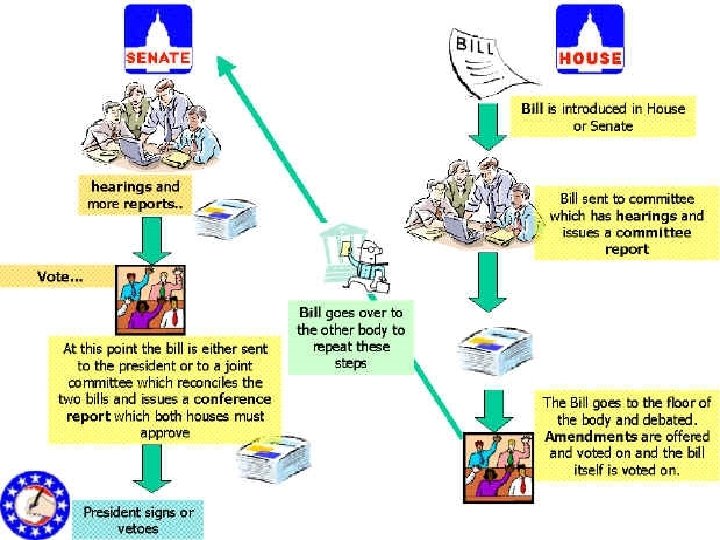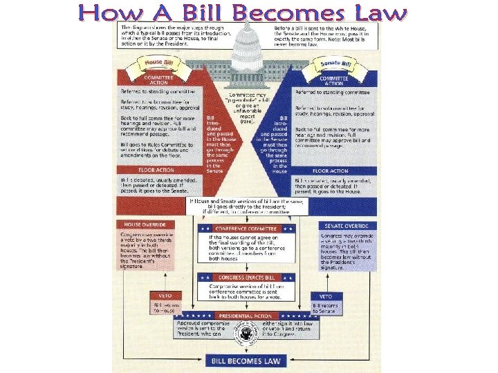 • Every bill submitted to a committee is typically goes to a subcommittee which can hold hearings on it. • Bills that make it out of committee are “marked up” (revised or rewritten) and then submitted to the House and Senate for consideration. • “Floor managers” of the bill help party leaders secure votes for it, & also serve as “cue-givers” to whom other members turn to for advice. • When the two chambers pass different versions of the same bill, some members of the committee will be appointed to a conference committee.