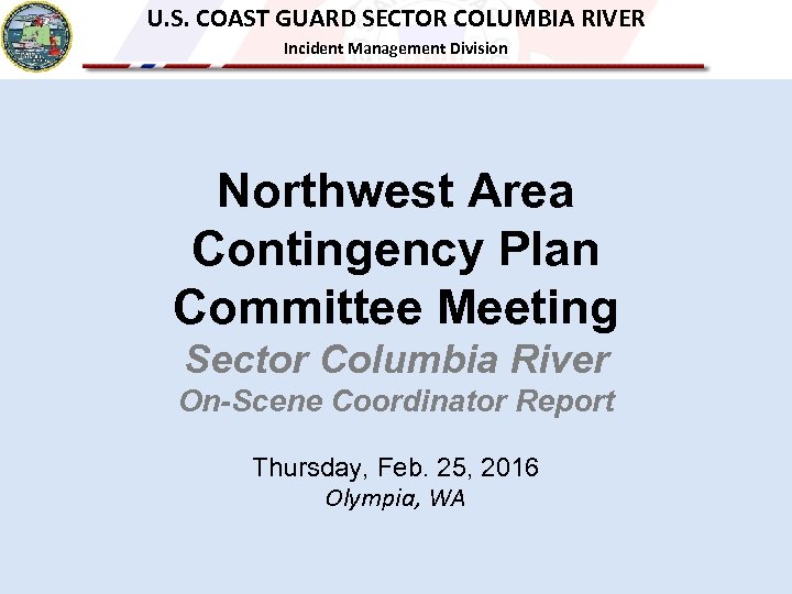 U. S. COAST GUARD SECTOR COLUMBIA RIVER Incident Management Division Northwest Area Contingency Plan Committee Meeting Sector Columbia River On-Scene Coordinator Report Thursday, Feb. 25, 2016 Olympia, WA