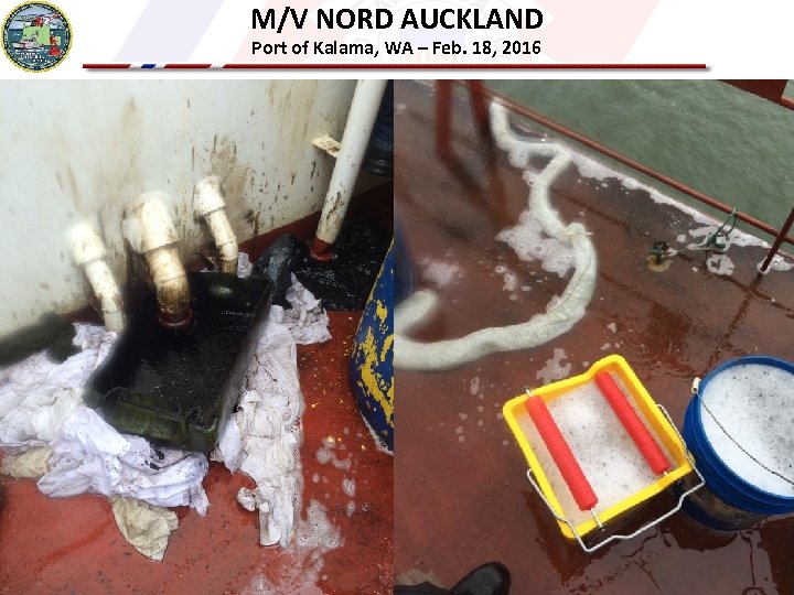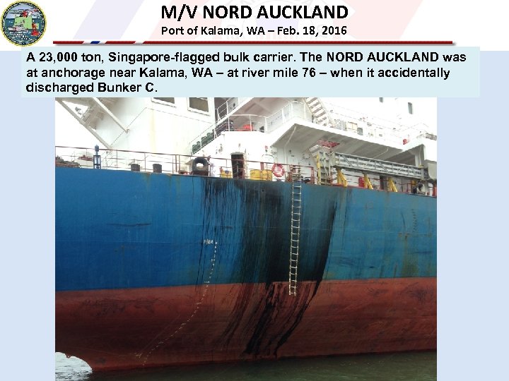 M/V NORD AUCKLAND Port of Kalama, WA – Feb. 18, 2016 A 23, 000 ton, Singapore-flagged bulk carrier. The NORD AUCKLAND was at anchorage near Kalama, WA – at river mile 76 – when it accidentally discharged Bunker C.