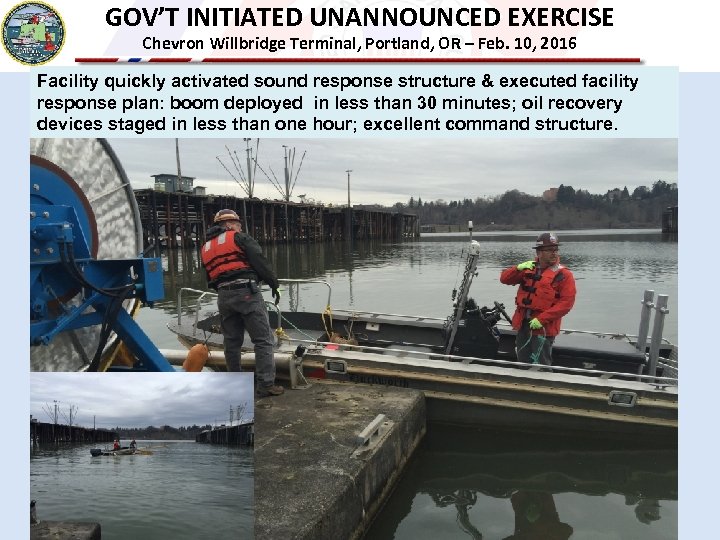 GOV’T INITIATED UNANNOUNCED EXERCISE Chevron Willbridge Terminal, Portland, OR – Feb. 10, 2016 Facility quickly activated sound response structure & executed facility response plan: boom deployed in less than 30 minutes; oil recovery devices staged in less than one hour; excellent command structure.
