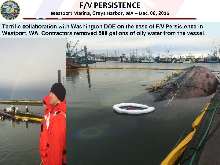 F/V PERSISTENCE Westport Marina, Grays Harbor, WA – Dec. 06, 2015 Terrific collaboration with Washington DOE on the case of F/V Persistence in Westport, WA. Contractors removed 500 gallons of oily water from the vessel.