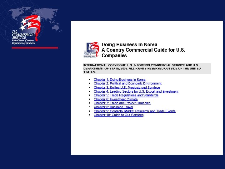 U. S. Commercial Service The U. S. Commercial Service is part of the U. S. Department of Commerce, an agency of the United States government. Our mission: 8 The U. S. Commercial Service promotes and protects U. S. commercial interests abroad and delivers customized solutions to ensure that U. S. businesses compete and win in the global marketplace. 8 Operates a seamless worldwide network of offices in 109 U. S. cities and at U. S. embassies and consulates in 80 countries.