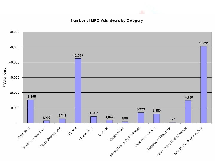 MRC Mission/Roles • “Ambassadors” of the U. S. Surgeon General…support SGs Priorities for Public Health – Increase Disease/Injury Prevention Efforts – Eliminate Health Disparities – Improve Public Health Preparedness • Specific missions and roles – locally determined