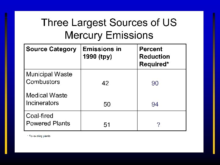 Ø 1998 1999 Ø 2000 Ø Ø 2001 Ø 2002 1 st draft Nation Mercury Action Plan TRI reporting threshold lowered NAS Toxicology Review Regulatory determination on coal-fired utilities CDC Exposure survey- >350, 000 newborns per year “at risk” Ambient water criterion tightened Utilities-Clear Skies Initiative UNEP