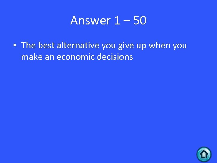 Answer 1 – 50 • The best alternative you give up when you make an economic decisions