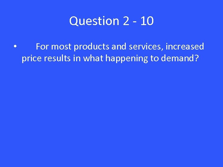 Question 2 - 10 • For most products and services, increased price results in what happening to demand?