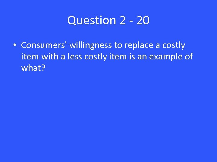 Question 2 - 20 • Consumers' willingness to replace a costly item with a less costly item is an example of what?