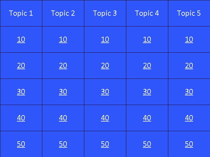 Topic 1 Topic 2 Topic 3 Topic 4 Topic 5 10 10 10 20 20 20 30 30 30 40 40 40 50 50 50