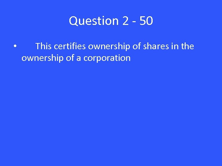 Question 2 - 50 • This certifies ownership of shares in the ownership of a corporation