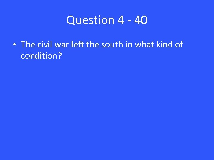 Question 4 - 40 • The civil war left the south in what kind of condition?