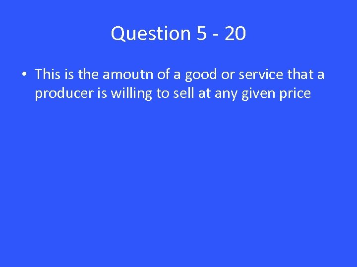 Question 5 - 20 • This is the amoutn of a good or service that a producer is willing to sell at any given price