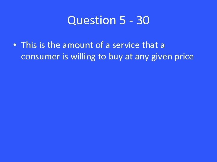 Question 5 - 30 • This is the amount of a service that a consumer is willing to buy at any given price