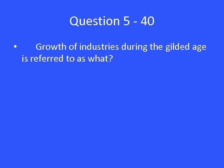 Question 5 - 40 • Growth of industries during the gilded age is referred to as what?