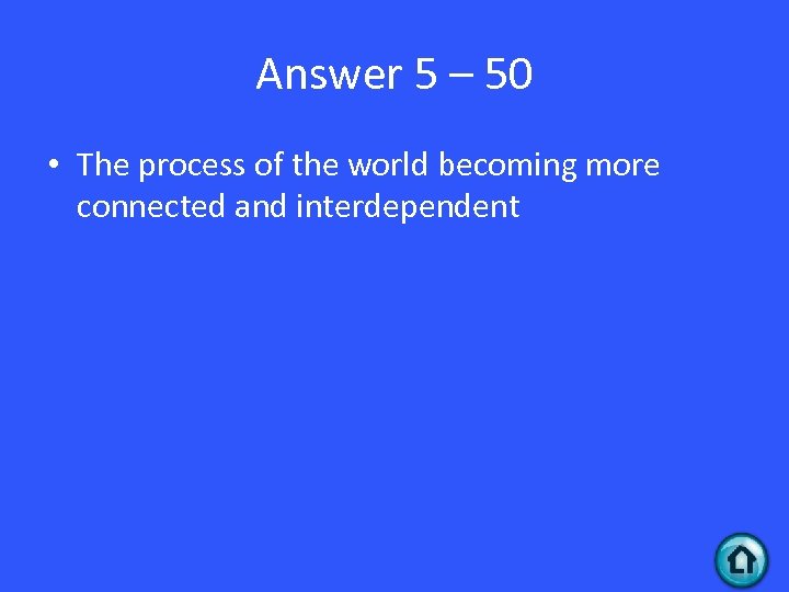 Answer 5 – 50 • The process of the world becoming more connected and interdependent