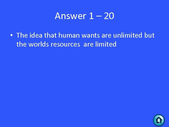 Answer 1 – 20 • The idea that human wants are unlimited but the worlds resources are limited