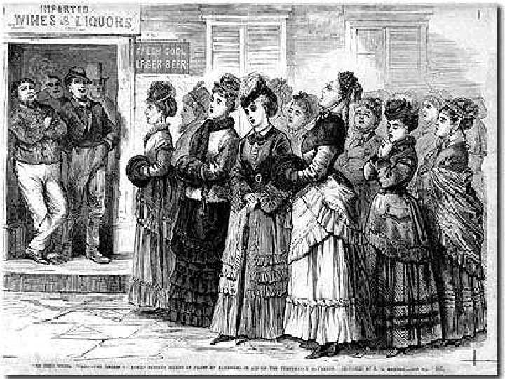 Reformers/Reform Movement l Women’s Christian Temperance Union (WCTU) l Group that led fight against alcohol, wanted prohibition l Believed alcohol was responsible for unemployment, crime, and divorce l Carrie Nation was a radical temperance crusader. Smashed saloons with hatchet l Accomplished goal with passage of 18 th Amendment