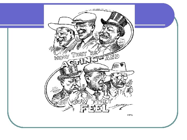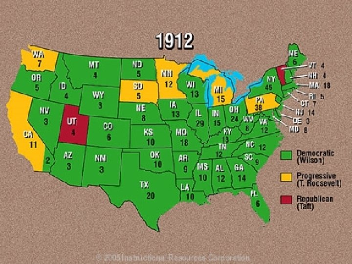 Election of 1912 l l l TR was upset with Taft’s leadership so he ran against him Republican Party splits Taft gets Republican Party nomination TR starts Progressive Party or “Bull Moose” Party 1912 Presidential Candidates l Democrats-Woodrow Wilson l Republicans-Taft l Progressive-TR l Socialists- Eugene Debs Wilson won, b/c of Republican split