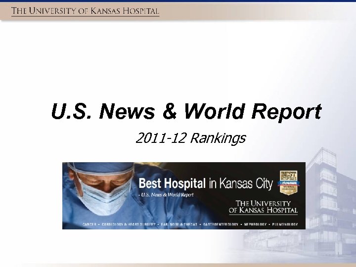 U. S. News & World Report Best Hospitals • Nearly 5, 000 hospitals were evaluated and ranked according to data such as procedure volumes, nurse-to-patient ratios, and patient and safety and survival. • The University of Kansas Hospital ranked nationally in these six specialty areas: – – – Cancer – No. 44 Cardiology & Heart Surgery – No. 39 Ear, Nose & Throat – No. 31 Gastroenterology – No. 35 Nephrology – No. 37 Pulmonology – No. 29 4
