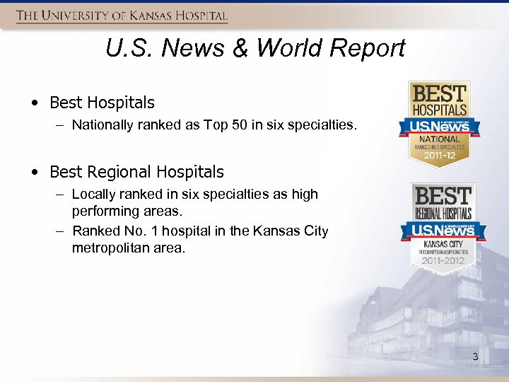 12 Specialties Ranked by U. S. News & World Report • Rankings are based on measureable achievements in quality, patient safety, nursing excellence and other indicators of the best in patient care. • The University of Kansas Hospital is the only area hospital with national rankings in adult specialties. 2