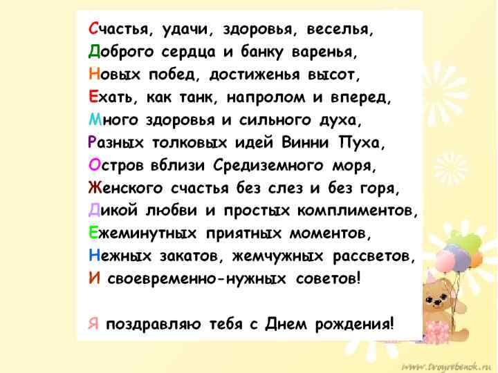 У тебя сегодня праздник – День рожденья! Это значит, Лишь тебе цветы, подарки – Пусть же день твой будет ярким! От души желаю счастья, Не встречать обид, ненастий, Пусть все дни успех наполнит, Жизнь желания исполнит. Радость пусть сияет в сердце, Даст любовь душе согреться, А улыбка и веселье «Сторожат» пусть настроенье!