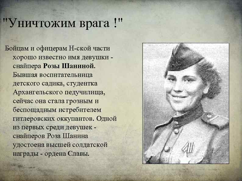"Уничтожим врага !" Бойцам и офицерам Н-ской части хорошо известно имя девушки - снайпера Розы Шаниной. Бывшая воспитательница детского садика, студентка Архангельского педучилища, сейчас она стала грозным и беспощадным истребителем гитлеровских оккупантов. Одной из первых среди девушек - снайперов Роза Шанина удостоена высшей солдатской награды - ордена Славы.