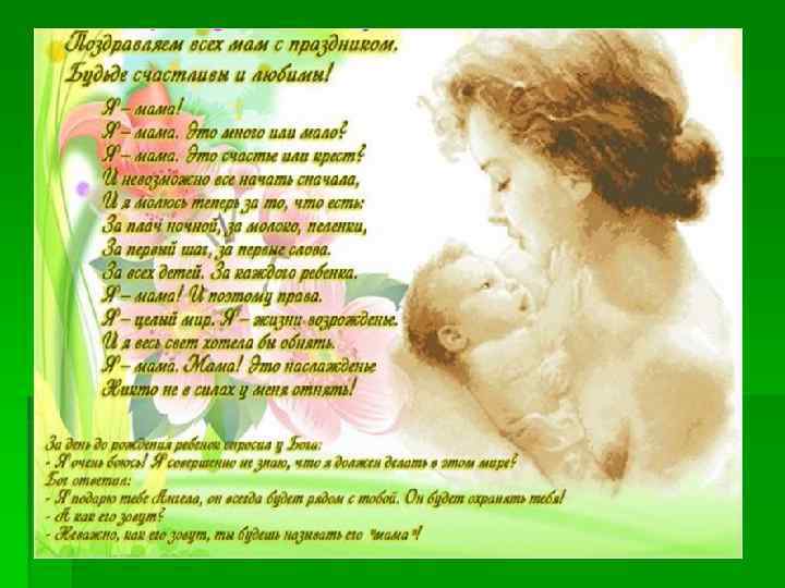 Прялухина Надежда Ивановна Обойди весь мир вокруг, только знай заранее Не найдешь теплее рук И нежнее маминых, Не найдешь на свете глаз Ласковей и строже, Мама каждому из нас Всех людей дороже. Сто путей, дорог вокруг Обойди по свету: Мама – самый лучший друг Лучше мамы нету!