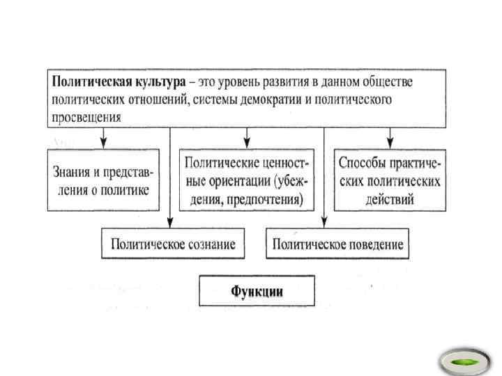 Функции Идентификация - раскрывает потребность человека в понимании своей групповой принадлежности, в стремлении определить приемлемые для себя способы участия в политике. Ориентация - стремление человека к смысловому отображению политических явлений. Адаптация - выражает потребность человека в приспособлении к изменяющейся политической жизни. Интеграция - обеспечивает различным группам возможность сосуществовать в рамках определенной политической системы, сохраняя целостность государства и общества. Коммуникация - связана с взаимодействием всех субъектов и институтов власти на базе использования символов, стереотипов и других средств информации и языка общения