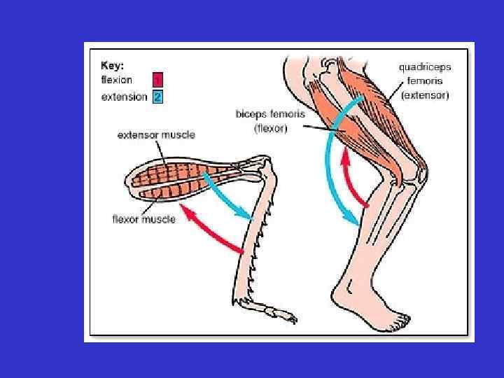 Организация опорно-двигательного аппарата Мышцы соединяются с суставами с помощью сухожилей. Сокращение мышц вызывают либо -сгибание либо разгибание конечностей Мышцы участвующие в этих движениях называются сгибателями или разгибателями. Мышцы с одной и той же функцией называются агонистами, с противоположной анатагонистами
