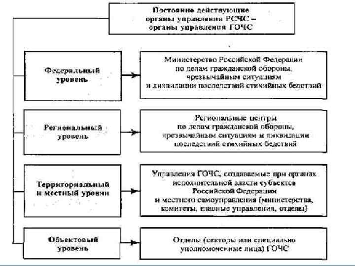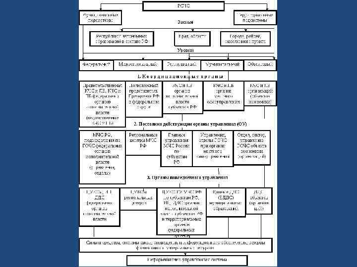 Единая система состоит из функциональных и территориальных подсистем действует на федеральном, межрегиональном, муниципальном и объектовом уровнях.