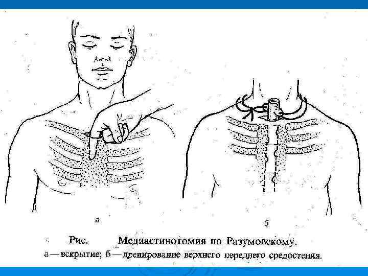 Рис. Медиастинотомия по Насилову. Вскрыто заднее средостение. Плевральный мешок отведён кнаружи.
