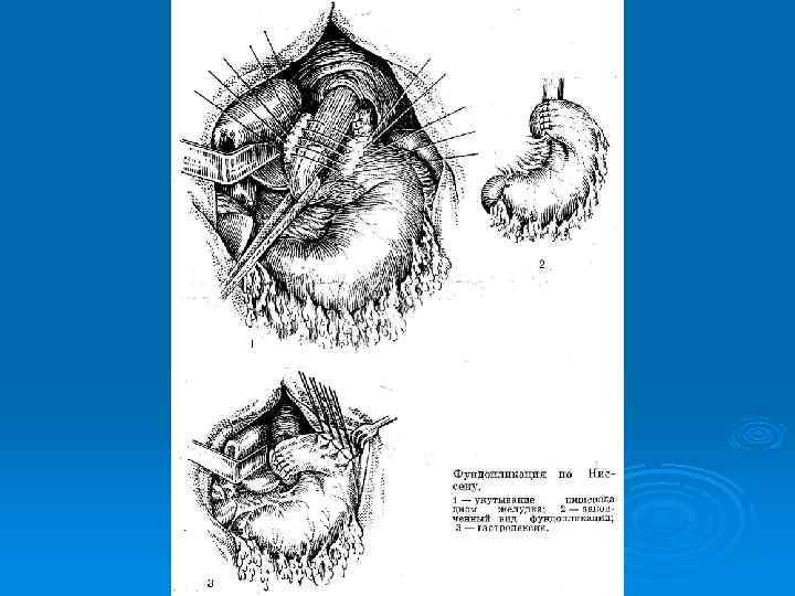 Показания к хирургическому лечению (В. В. Уткин, Б. К. Апинис, 1976) Ø Ø Ø Ø 1 - Рефлюкс-эзофагит с характерными клиническими проявлениями, потверждёнными инструментальными исследованиями. 2 - Выраженная клиническая симптоматика ГПОД и отсутствие эффекта от консервативной терапии. 3 - Повторные кровотечения и развитие гипохромной анемии. 4 - Параэзофагеальная грыжа (опасение возможности её ущемления). 5 - Наличие пептической стриктуры пищевода. 6 - Наличие сопутствующих заболеваний, требующих хирургического лечения. 7 - Рецидивы ГПОД после хирургического лечения. Экстренная операция при ущемлении ГПОД и кровотечении.