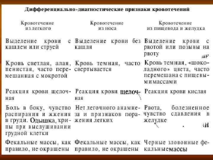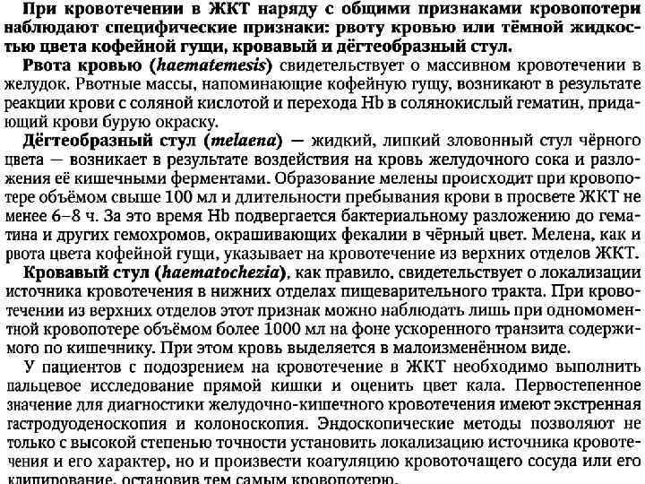Основные клинические проявления острых гастродуоденальных кровотечений из верхних отделов ЖКТ Складываются из : 1. Обших симптомов, характерных для кровотечения: резкая слабость, головокружение, потеря сознания, бледность кожи, частый пульс слабого наполнения и напряжения снижение АД; 2. Проявления, характерные для кровотечения в просвет ЖКТр: Гематомезис – кровавая рвота. Мелена – чёрный жидкий дёгтеобразный стул (не менее 200 мл крови). Гематохезия – кровавый стул (очень редко).