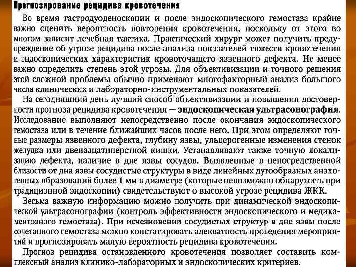 Среди факторов прогноза рецидива кровотечения эндоскопические данные являются определяющими n n Когда дно язвы после кровотечения чистое, рецидив кровотечения возможен в 5 -7% случаев, послеоперационная летальность не превышает 2%. Когда язва полностью или частично заполнена свёртком крови, рецидива кровотечения можно ожидать у 20% больных, а летальность после экстренных операций достигает 5 -75%. Когда же на дне язвы виден крупный тромбированный сосуд, рецидив кровотечения наступает у 40% больных, а летальность превышает 10%. При продолжающемся струйном кровотечении или подтекании крови из-под свёртка крови, которое удаётся остановить при ФГДС, рецидив кровотечения возникает у 50% больных, а послеоперационная летальность достигает 15%.