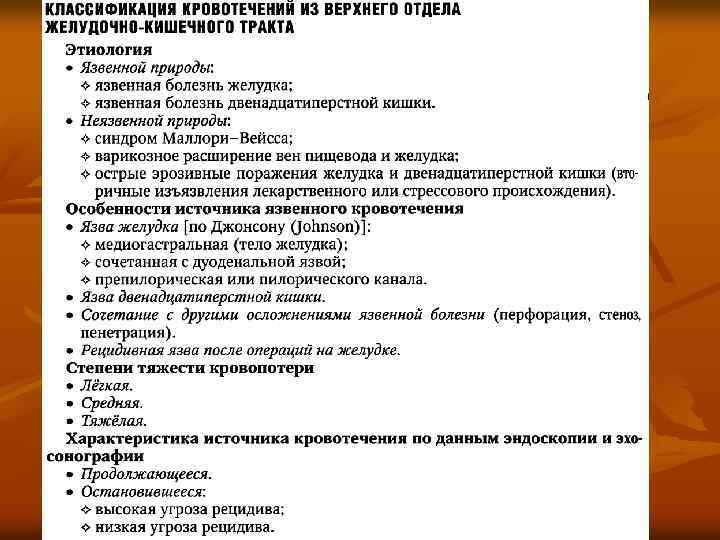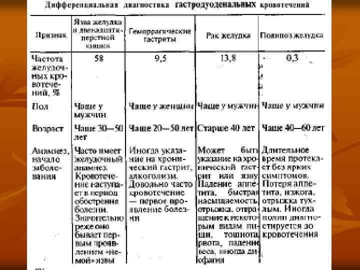 Диагностическая программа при острых гастродуоденальных кровотечениях: 1. Установить факт кровотечения. 2. Источник кровотечения (его характер и локализацию). 3. Продолжается кровотечение в настоящий момент или оно остановилось. 4. Эндоскопическая оценка степени активности кровотечения. 5. В случае остановившегося кровотечения оценить степень устойчивости гемостаза, угрозу рецидива. 6. Определить величину кровопотери. 7. Оценить тяжесть сопутствующей патологии.
