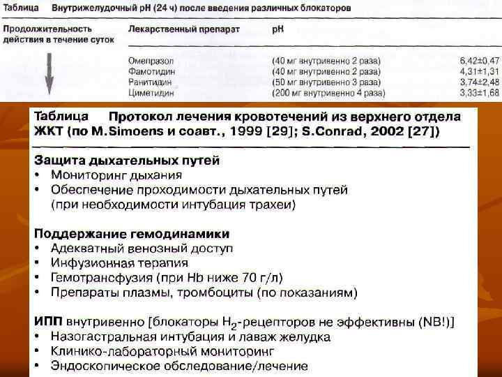 n К возможным причинам появления рецидивов кровотечений относят: - повторное инфицирование больных HP, - рецидив язвенной болезни, возникший на фоне приёма НПВС, - появление симптоматических язв. n Успешная эрадикация HP предупреждает рецидивы кровотечений у больных язвами 12 -перстной кишки по меньшей мере в течение 4 лет. n Принципиально важным при лечении таких больных считаем поддержание круглосуточно р. Н желудочного содержимого, равного 5, 0 -6, 0, что может быть обеспечено в/в введением омепразола или фамотидина в течение 3 суток с переходом на таблетированнные формы. n Не менее важно динамическое эндоскопическое наблюдение, мониторинг состояния язвы (обычно каждые 24 часа в первые 3 -4 дня госпитализации. После эндогемостаза контрольная ФГДС через 6 часов).