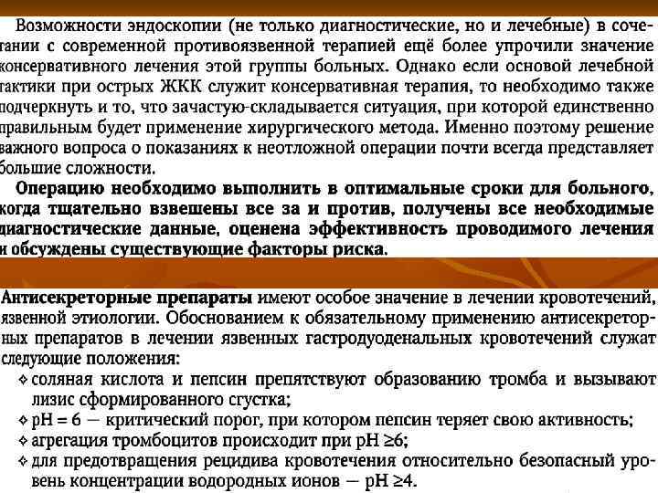 1 - При массивном артериальном кровотечении из язвы применяющиеся методики остановки кровотечения с помощью эндоскопа в большинстве случаев неэффективны. 2 – Настойчивые попытки остановить кровотечение, используя эндоскопические методики приводят в конечном итоге к запоздалым в связи с глубокими изменениями гомеостаза оперативным вмешательствам, упущению благоприятных сроков их выполнения и высокой летальности, достигающей среди таких больных 70%. Таким образом, остаётся нерешённой основная суть проблемы ОГДК – улучшение результатов лечения, уменьшение общей и послеоперационной летальности. - Следует отметить, что HCL и пепсин при развившемся кровотечении ингибируют тромбообразование и вызывают лизис уже образовавшихся тромбов. Агрегация тромбоцитов (сосудисто-тромбоцитарный гемостаз) происходит только при значениях р. Н>6, 0.
