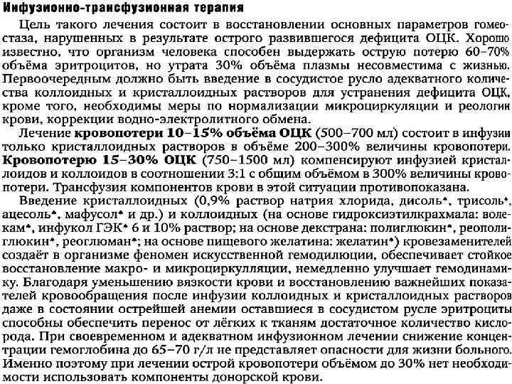 До настоящего времени при возмещении кровопотери достаточно широко используют также средне- молекулярные растворы декстрана, такие, как декстран-70* или его отечественный аналог полиглюкин*. Они эффективно повышают коллоидноосмотическое давление крови и длительно удерживаются в сосудистом русле. Вместе с тем декстраны обладают достаточно высокой реактогенностью и могут вызывать анафилактоидные и анафилактические реакции. Суточная доза декстранов не должна превышать 1000 мл. Введение больших объёмов растворов приводит к возникновению «декстранового ожога почки» и блокирует ретикуло- эндотелиальную систему. Остальные коллоидные плазмозаменители ещё в меньшей степени отвечают требованиям медикотактической обстановки и патогенетическим концепциям. Например, желатины задерживаются в кровеносном русле всего 2 -3 ч и к тому же обладают выраженным гистаминоподобным действием и сами могут вызывать снижение АД. Особого внимания заслуживает проблема воздействия коллоидных плазмозаменителей на систему свёртывания крови. Препараты гидроксиэтилированного крахмала практически не влияют на неё, а растворы на основе декстрана занимают первое место среди коллоидов по отрицательному воздействию на эту систему. Они блокируют адгезивные свойства тромбоцитов и снижают их функциональную активность, уменьшают активность факторов II, V и VII, тем самым замедляют свёртывание крови и препятствуют остановке кровотечения. Их способность обволакивать поверхность эритроцитов может служить препятствием при определении группы крови пострадавшего пациента. Растворы декстранов при кровопотере целесообразно использовать после надёжной остановки кровотечения. Желатин также в существенной степени ингибирует агрегацию тромбоцитов, что может приводить к усилению кровотечения. Введение 1500 мл раствора желатина создаёт ситуацию, по симптомам аналогичную болезни Виллебранда.