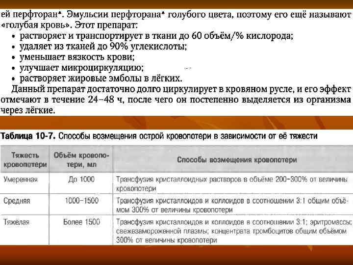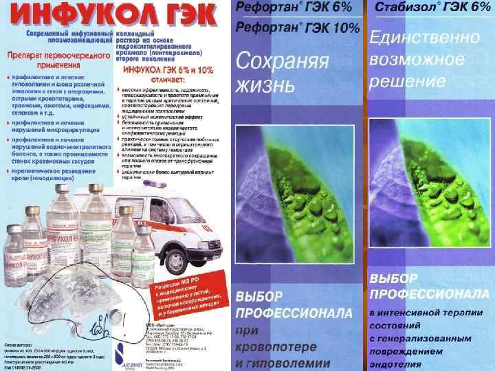 «Малообъёмная реанимация» n n - Создание комбинированных препаратов гиперосмотических солевых растворов (7, 5% натрия хлорида) с гиперонкотическими растворами коллоидов (декстраны, ГЭК). В результате появились препараты (так называемые гиперосмотические гиперонкотические объёмозамещающие растворы), дающие возможность достичь быстро и стойкого волемического и гемодинамического эффектов при инфузии небольшого объёма (4 мл/кг массы тела). Суть методики – во взаимодействии компонентов: коллоиды не дают солевому раствору покинуть сосудистое русло, а гипертонический раствор натрия хлорида значительно усиливает волемический эффект, что позволяет уменьшить коллоидную нагрузку. Гиперосмотические гиперонкотические растворы определены в качестве стратегических средств для помощи на поле боя в армиях США и НАТО. Методика имеет большие перспективы для терапии острой кровопотери как на до госпитальном этапе, так и в плановой хирургии.