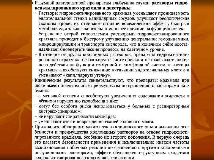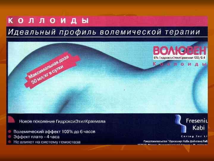Преимущества растворов ГЭК Молекулы ГЭК способствуют снижению активации эндотелиальных клеток и уменьшают «капиллярную утечку» . n Именно фракции ГЭК с молекулярной массой 60 000 и 350 000 дальтон участвуют в восстановлении порозных стенок капилляров при остром поражении. Только эти фракции эффективно блокируют потерю альбумина и жидкости из внутрисосудистого пространства в интерстиций. n Растворы ГЭК обеспечивают более выраженное и более длительное объёмозамещающее действие. n Характеризуются более длительным сроком пребывания в сосудистом русле. n Эффективно повышают коллоидно-осмотическое давление ( КОД). n