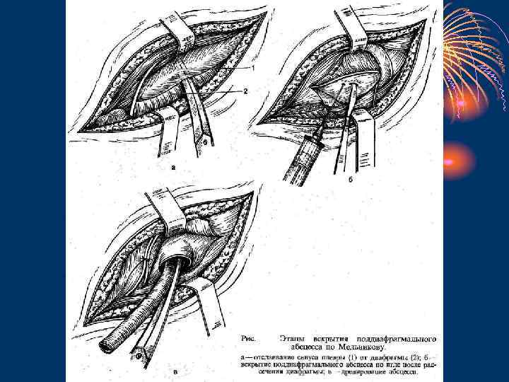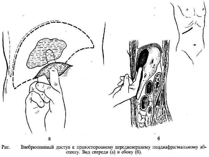 Рис. Дренирование передневерхнего надпечёночного абсцесса справа. Внебрюшинный доступ к правостороннему задненижнему поддиафрагмальному пространству.