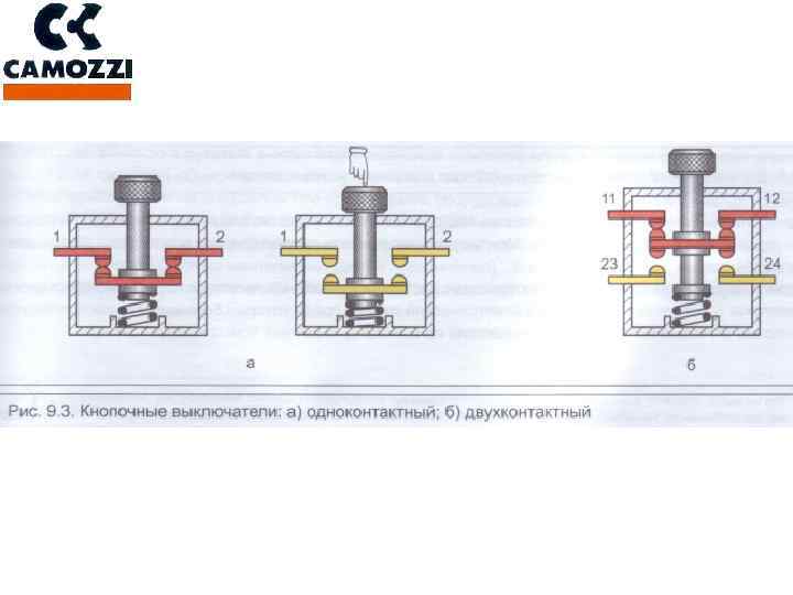 КОНТАКТНЫЙ ДАТЧИК (конечный или путевой выключатель) 1 – механический объект, приводимый в движение пневмоцилиндром 2 – ролик 3 – плунжер 4 – электрические контакты датчика Нормально разомкнутые контакты разомкнуты. Нормально замкнутые контакты замкнуты. 5 – корпус датчика Нормально разомкнутые контакты замкнуты. Нормально замкнутые контакты разомкнуты.