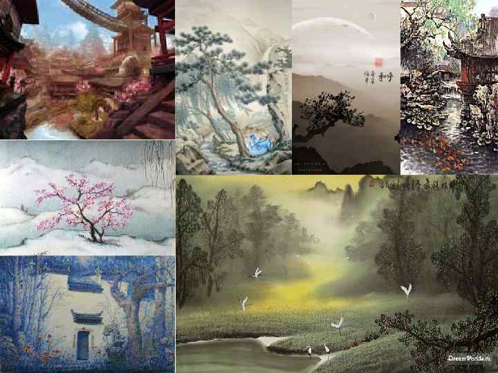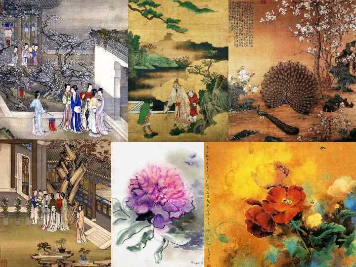 Живопись. Китайская картина • Китайская картина не является картиной в нашем понимании. У неё нет ни тяжёлой золочёной рамы, ни даже тонкого багета, который бы ограничивал её от плоскости стены, превращая в изолированный замкнутый мир. Да и зачем нужна была китайской картине рама, если эта узкая и длинная полоса бумаги или специально обработанного проклеенного шёлка с двумя валиками по краям бережно хранились в специальных ящиках и развёртывалась только в редких случаях для рассматривания. С древнейших времён, по всей видимости на рубеже нашей эры, была выработана эта форма живописных свитков. В Китае, где в помещениях не было прочных и массивных стен, как в Европе, а воздух в комнатах во многом определялся климатом улицы, вывешивать картины, не защищённые, как у нас, стеклом, было бы для них вредно. Вместе с тем картина бала своего рода ревниво оберегаемой драгоценностью, которую не принято было выставлять на всеобщее обозрение и которая коллекционерами показывалась только узкому кругу ценителей. • Китайские свитки имеют две формы. Одна из них вертикальная, когда развёрнутый и повышенный на стену свиток висит перпендикулярно к полу, и другая горизонтальная, когда свиток постепенно развёртывается и по мере рассматривания снова свертывается на столе. Вертикальные свитки обычно не превышают 3 метров, тогда как горизонтальные, являясь своеобразной панорамой, иллюстрированной повестью, где показана либо серия объединённых в единую