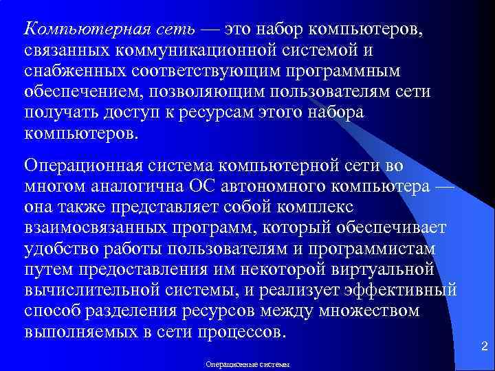 Компьютерная сеть — это набор компьютеров, связанных коммуникационной системой и снабженных соответствующим программным обеспечением, позволяющим пользователям сети получать доступ к ресурсам этого набора компьютеров. Операционная система компьютерной сети во многом аналогична ОС автономного компьютера — она также представляет собой комплекс взаимосвязанных программ, который обеспечивает удобство работы пользователям и программистам путем предоставления им некоторой виртуальной вычислительной системы, и реализует эффективный способ разделения ресурсов между множеством выполняемых в сети процессов. 2 Операционные системы
