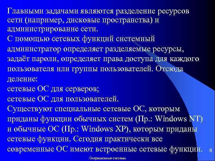 Главными задачами являются разделение ресурсов сети (например, дисковые пространства) и администрирование сети. С помощью сетевых функций системный администратор определяет разделяемые ресурсы, задаёт пароли, определяет права доступа для каждого пользователя или группы пользователей. Отсюда деление: сетевые ОС для серверов; сетевые ОС для пользователей. Существуют специальные сетевые ОС, которым приданы функции обычных систем (Пр. : Windows NT) и обычные ОС (Пр. : Windows XP), которым приданы сетевые функции. Сегодня практически все современные ОС имеют встроенные сетевые функции. 4 Операционные системы